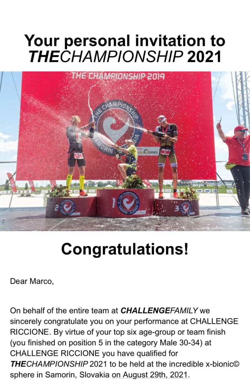 Marco Capocci si è qualificato per il mondiale del circuito Challenge dopo il quinto posto ottenuto alla Mezza di Riccione. In virtù di questo piazzamento l’atleta dell’#iloverun Athletic Terni prenderà parte al The Championship 2021 che si terrà nell’incredibile x-bionic sphere di Samorin, in Slovacchia, il prossimo 29 agosto. Capocci sarà in gara nella half distance: 1.9 km di nuoto, 90 km in bici, 21 km di corsa.
